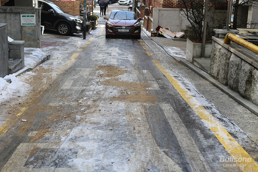 도로가 미끄러운 겨울철에는 오르막길과 내리막길 주행 시 유의해야합니다. 오르막길 주행 시에는 브레이크를 밟고 떼는 과정에서 순간 차량이 뒤로 밀려 사고가 발생할 수 있습니다. 이때 중간에 멈추지 말고, 기어를 2단으로 조정하여 한 번에 올라가야 합니다. 또한 앞 차가 언덕을 올라가지 못하고 있다면, 다른 길로 우회하여 주행해 주세요!