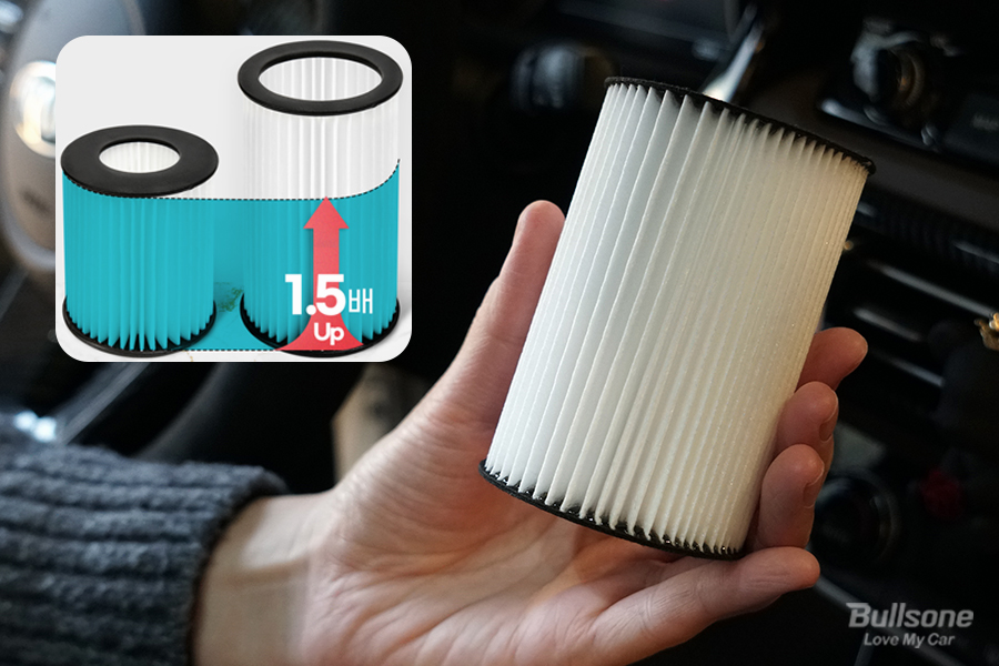 새로 나온 에어테라피 멀티액션 프로는 기존 제품 대비 151% 확대된 여과 필터 면적을 자랑합니다. 그만큼 공기청정 능력이 뛰어난데요. 360도 흡착 설계, H13급 헤파원단*을 적용한 초미세먼지 집진필터 장착으로 오염된 차 안 공기를 정화합니다. 또한 최저 24.4dB의 저소음으로 운전 중에도 거슬림 없이 편안합니다.