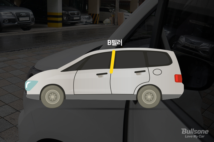 B필러는 센터 필러 또는 사이드 필러라고도 부릅니다. 차량 앞, 뒷문의 경첩 역할을 하여 차체 중앙에 위치하는데요. 차체 전체 강성을 잡아주는데 가장 직접적인 영향을 줍니다. A필러가 자동차 전면 충돌에서 발생하는 충격을 완화시켜준다면, B필러는 차량 측면에서 발생하는 사고 발생 시 충격을 분산시킵니다. 또한 운전자의 안전벨트를 고정하는 부분이기도 합니다. 이로 인해 B필러가 없는 오픈카의 경우, 전복 사고가 발생하면 탑승자가 굉장히 큰 위험에 노출될 수 있습니다.