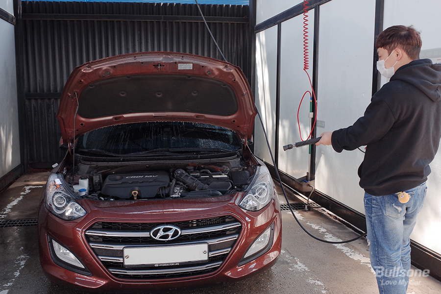 가장 먼저 자동차 시동을 끄고, 엔진룸 열기를 충분히 식혀줍니다. 다음으로 세차장에 있는 에어건이나 세차용 붓으로 엔진룸 내부 먼지를 제거합니다. 이때 먼지를 제거하는 방향은 가급적 엔진룸 바깥쪽 방향으로 털어줍니다.