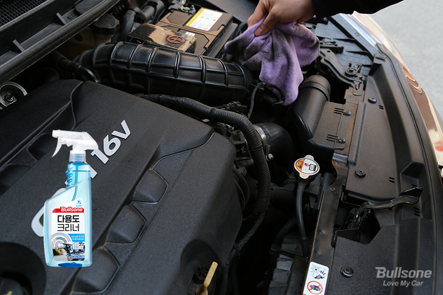 먼지를 제거했다면, 다음으로 전용 세정제를 사용하여 기름때와 각종 오염물을 제거합니다. 이때 사용하면 좋은 제품으로 불스원 다용도 크리너를 추천합니다.