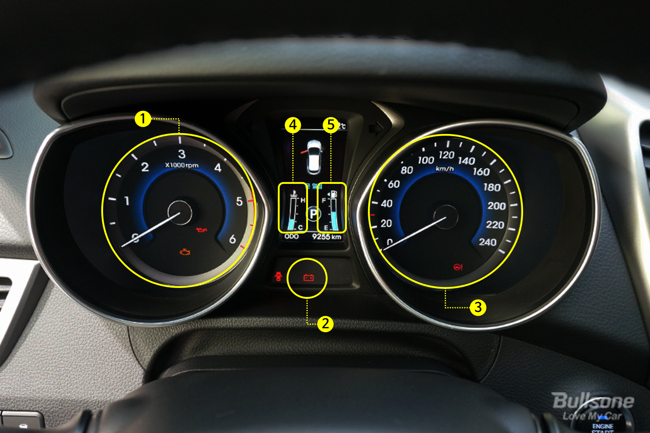 *주요 경고등 : 브레이크 경고등, 배터리 충전 경고등, 냉각수 수온 경고등 등
