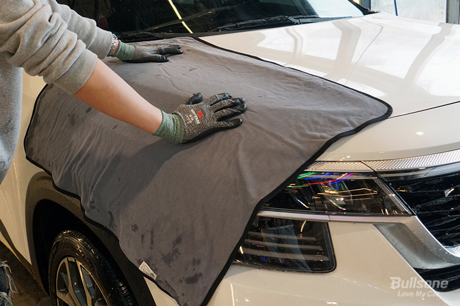 드라잉 타월을 사용할 때는, 타월의 아래 모서리 끝을 양손으로 각각 잡고 물기가 있는 도장면 위에 올려놓은 후 끌어당기는 방법을 추천합니다.