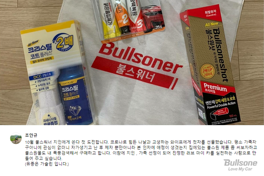 불스워너 활동은 항상 많은 신제품들과 든든한 지원 덕분에 차량용품에 대해서 더 많이 알아갔던 시간이었습니다. 주변의 지인들에게도 불스원 제품을 나눠주는 기회를 얻어, 이를 계기로 불스워너에 관심을 가지던 지인 분들도 많았습니다.