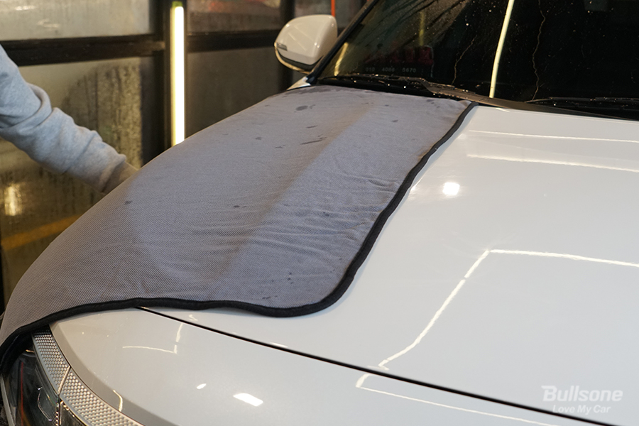 고압수로 외관 전체를 충분히 헹궈준 뒤 드라잉 타월을 사용하여 물기를 제거해야 합니다. 이때 제대로 물기를 제거하지 않으면 도장면에 워터스팟이 생길 수 있으므로 구석구석 꼼꼼하게 닦아주세요.