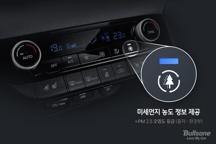 공기청정모드 기능은 제조사별로 조금씩 다른데요. 현대자동차의 경우 마이크로 에어 필터와 함께 미세먼지 농도까지 측정할 수 있는 공기청정 시스템을 차량에 탑재했습니다. 이 기능을 통하여 공기 질에 따른 공기청정 기능이 가동됩니다. 이 외에도, 에바포레이터에 맺힌 응축수를 건조시켜 곰팡이를 억제하는 애프터 블로우 기술과 실내 미세먼지 농도를 실시간으로 운전자에게 전달하는 실내 미세먼지 상태 표시 기술을 제공하고 있습니다.