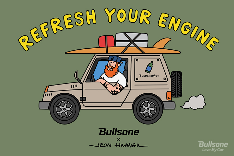 이번 불스원샷 콜라보 굿즈는 일러트스레이터 전황일과의 협업을 통해 탄생했습니다. 전황일 작가님은 남자들의 라이프스타일과 서브컬쳐를 메인 테마로 그림을 그리는 일러스트레이터로 다양한 브랜드와 협업하며 특유의 자유로운 면모를 보여주고 있는데요. 이번 불스원과의 콜라보레이션 작업에서는 불스원샷과 자동차, 그리고 라이프스타일을 경쾌하게 표현했습니다.