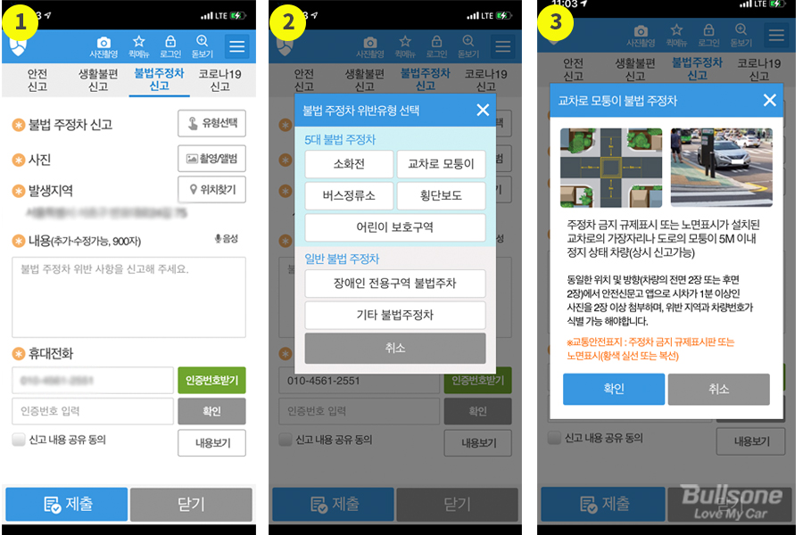 불법주정차는 안전신문고(구 생활불편신고) 앱을 통하여 간단하게 신고할 수 있습니다. 안전신문고 앱을 다운로드하고 퀵 메뉴의 불법 주정차 신고를 누르면 되는데요. 이후 불법주정차 위반 유형을 선택한 후 불법 주정차를 촬영하여 올리면 됩니다. 이때 동일한 위치 및 방향(차량 전면 또는 후면 2장)과 함께 1분 간격으로 동일한 배경에서 촬영한 사진이 두 장 필요합니다. 또한, 위반 지역과 차량번호가 식별이 가능하게 찍어야 됩니다.