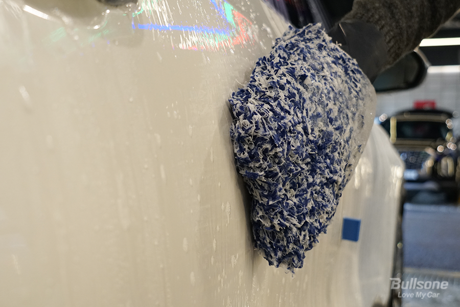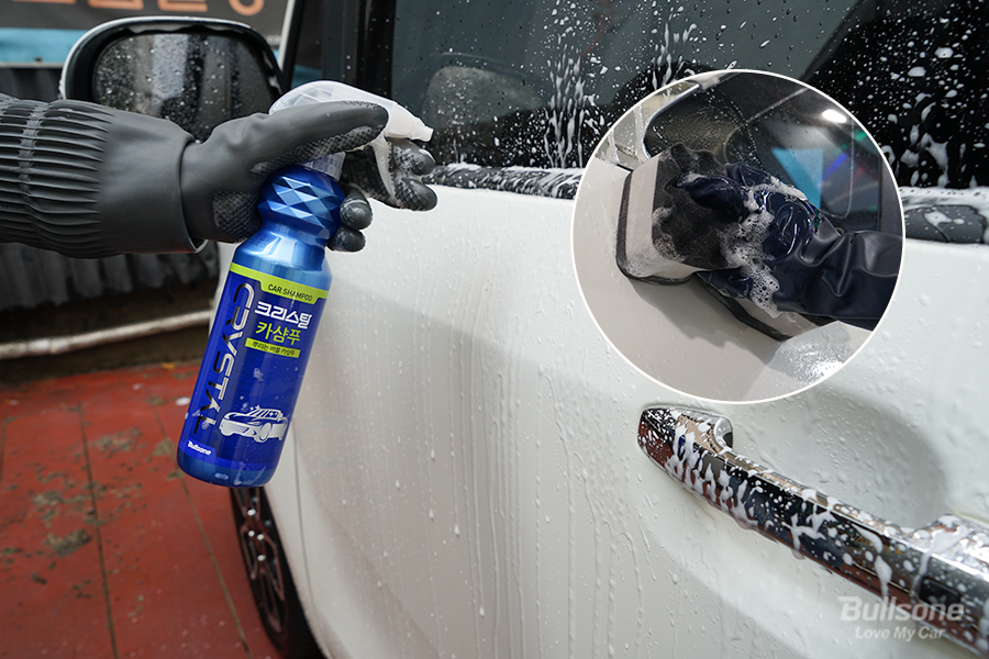 폼건 프리워시로 지워지지 않은 묵은 얼룩과 오염물은 카샴푸를 이용해 제거하면 되는데요. 불스원 크리스탈 카샴푸를 차에 골고루 뿌린 후, 퍼펙트 3중 세차스펀지를 활용하여 꼼꼼하게 닦아 줍니다. 차량에 흠집이 생기지 않도록 카샴푸의 거품을 충분히 낸 후 도장면을 닦아야 합니다.