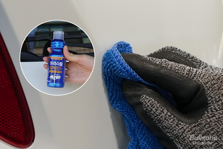 물기 제거 후, 지워지지 않은 흠집 및 스월마크는 불스원 크리스탈 컴파운드를 이용해 제거해 줍니다. 크리스탈 컴파운드를 충분히 흔들어 부드러운 타월에 묻혀준 후, 힘을 주어 스크래치의 지각 방향으로 겹치듯 문질러 줍니다. 스월마크, 페인트 제거 시에는 오염 부위에 원을 그리듯 문질러 줍니다.