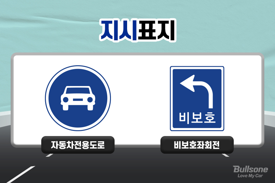 - 자동차 전용도로 : 자동차전용도로 표지판은 오토바이, 보행자 등의 통행을 금지하고 자동차만 이용할 수 있다는 표시입니다.
