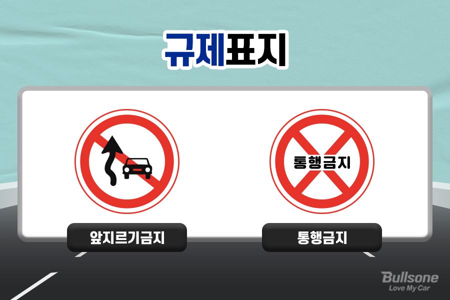 - 앞지르기 금지 : 사고위험이 높은 구간에 설치되어 있는 표지판으로, 터널 안, 다리 위, 교차로, 굽은 도로, 가파른 길 등에 설치되어 있습니다.