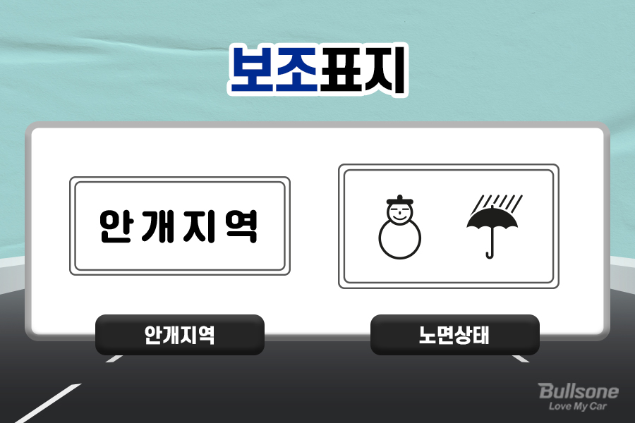 보조표지는 주의, 규제, 지시의 주요 기능에 설명을 더하기 위해 함께 설치되는 표지판으로 백색 바탕에 정사각형 또는 직사각형의 형태로 되어있습니다.
