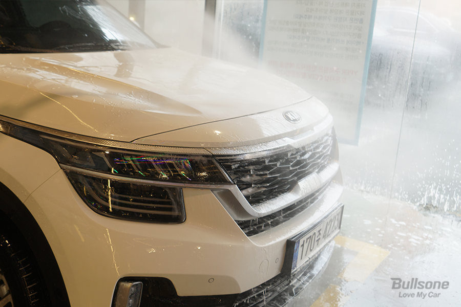 엔진룸 열기가 식었다면 본격적으로 청소를 해야겠죠? 모든 세차 순서는 차 지붕에서 아래로 이어지는 것인데요. 먼저 지붕에서부터 유리, 차체 순서로 물을 뿌려주세요. 고압수로 구석구석 끼어있는 이물질을 제거해야 다음 세차 과정에 방해가 되지 않습니다. 만약 흙이나 모래가 끼어있는 채로 거품 솔로 차체를 문지르게 되면, 도장면에 손상이 생길 수 있으니 주의해 주세요!