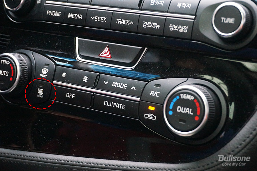 자동차 김서림은 차량 전면 유리뿐만 아니라 후면 유리와 사이드미러에도 발생할 수 있는데요. REAR 버튼을 눌러주면 후면과 사이드미러 열선이 작동하여 유리면에 맺힌 물방울을 증발시켜 줍니다. 이때 차량 뒷면 유리를 보면 보이는 주황색 실선이 바로 열선입니다. 또한 REAR 버튼을 누르고 다시 끄는 것을 깜박해도 문제없습니다. REAR 버튼은 보통 15~20분 정도 작동된 후 자동으로 꺼집니다.