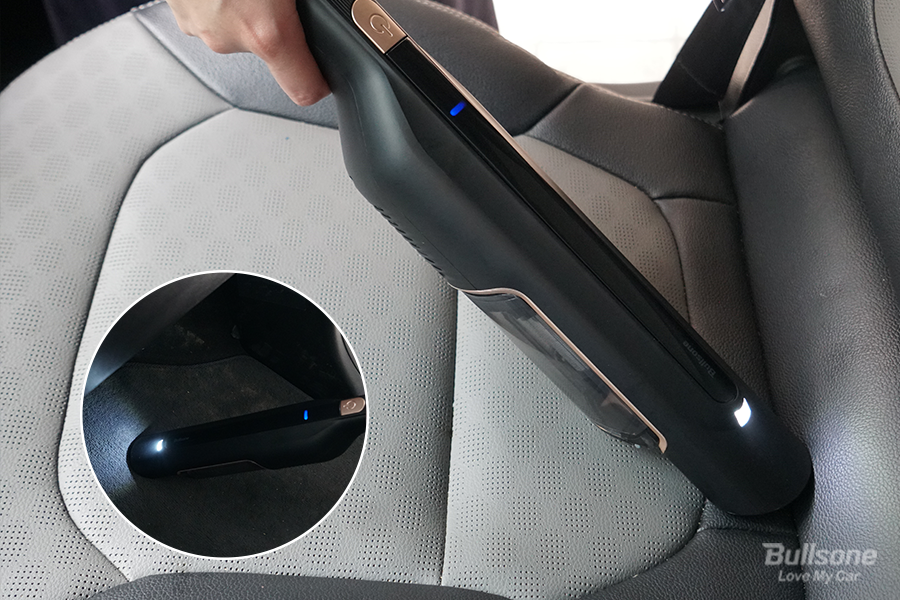 가장 먼저, 불스원 파워슬림 BLDC 무선청소기로 시트와 매트 사이에 남아있는 눈에 보이는 큰 이물질을 제거해 줍니다.