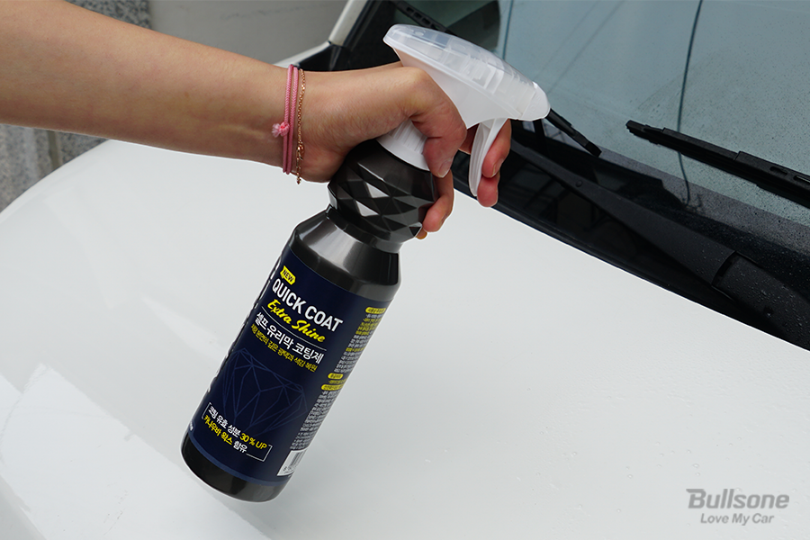 크리스탈 퀵 코트 엑스트라 샤인은 적은 양의 물기가 있는 상태에서도 사용이 가능합니다. 보닛 기준으로 2~3회 적절히 분사해 사용하면 되는데요. 차량의 부위별로 작업해 주시면 훨씬 효율적으로 작업이 가능합니다. 크리스탈 퀵 코트 엑스트라 샤인은 발림성도 좋고 뭉침도 적어 초보자분들도 쉽게 좋은 광택을 만들어 내실 수 있습니다!