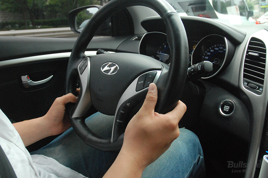 좌석 조절이 끝났다면 핸들 높이를 조절해야 합니다. 먼저 핸들을 잡았을 때 팔이 자연스럽게 구부러지는지 확인해 보세요. 무릎과 핸들 사이는 대략 주먹 하나 정도 들어가는 거리로 맞춰주시면 된답니다. 핸들의 엠블럼 위치로도 파악할 수 있는 방법이 있는데요. 좌석에 등을 붙인 상태에서 핸들 가운데 엠블럼이 가슴의 정중앙에 위치하는지 확인해 주시면 됩니다. 핸들 높이 체크는 사고 시 에어백이 펴지는 부분이니 잘 확인해 주세요.