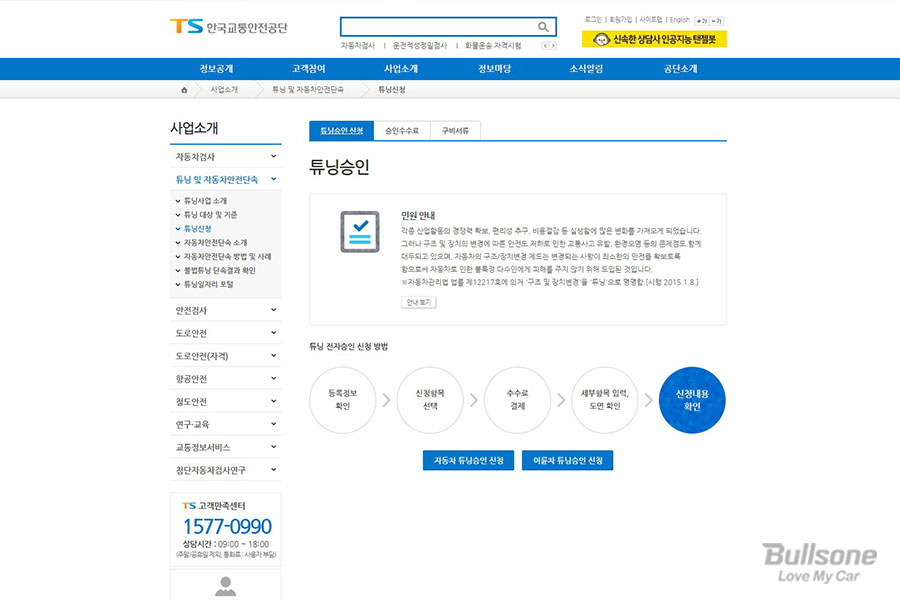 튜닝은 크게 승인, 작업, 검사 순으로 이루어집니다. 승인 단계에서는 한국교통안전공단으로부터 사전 승인을 받아야 하는데요. 무분별한 튜닝은 교통사고 및 환경오염을 야기할 수 있기 때문입니다. 튜닝 승인 신청은 한국교통안전공단 검사소에 방문하거나 한국교통안전공단 사이버검사소 웹페이지에서 온라인으로 가능합니다. 이후 튜닝 정비 및 제작 업체에서 승인 내용과 동일하게 튜닝 작업을 시행하고, 승인일로부터 45일 이내에 한국교통안전공단 검사소에서 안전성 검사를 받으면 튜닝 절차가 완료됩니다.