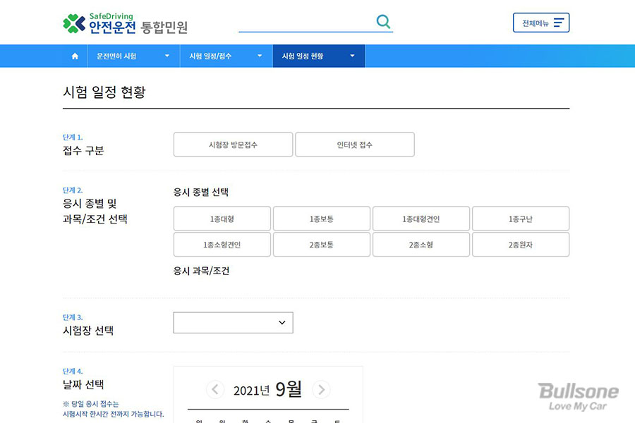 안전운전 통합민원 사이트에서 간편하게 소형견인차면허를 접수할 수 있습니다. 사이트 내 운전면허시험 카테고리에서 운전면허 시험 접수를 클릭해주시면 됩니다. 혹은 운전면허 시험 일정 현황 탭에서 시험장 및 일정 확인 후 접수하시는 것도 가능합니다.