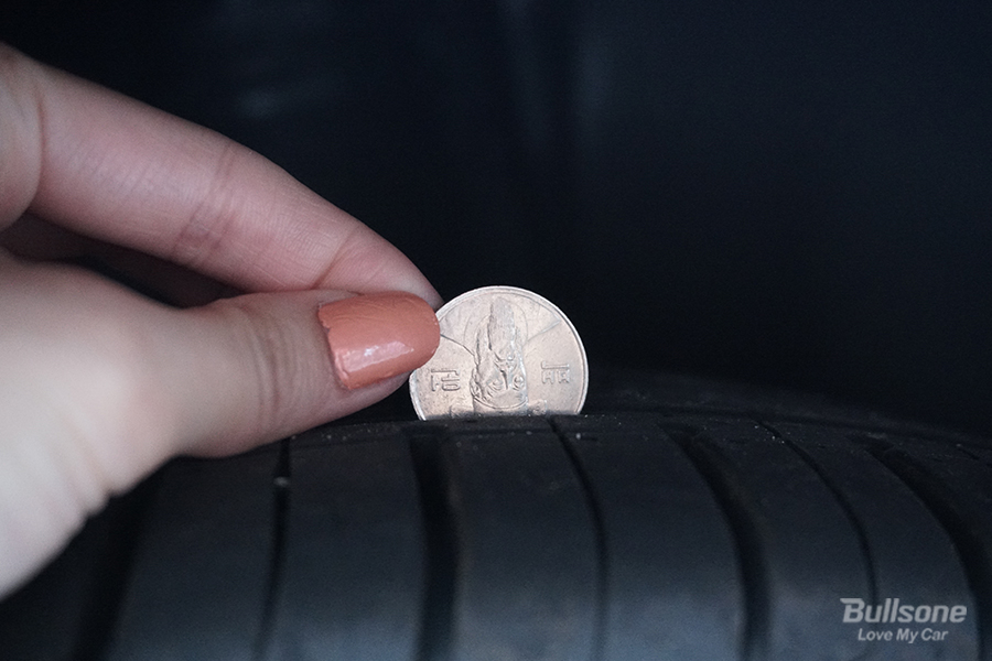 타이어 마모도는 100원 동전으로 쉽게 측정해볼 수 있는데요. 타이어 그루브에 100원짜리 동전을 거꾸로 끼워 이순신 장군의 감투가 2/3 이상 보이면 마모가 진행된 상태이니 타이어를 교체하는 것이 좋습니다.
