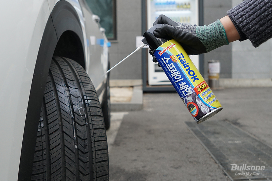2. 바퀴접지면에 골고루 뿌려주세요. 특히 구동바퀴(일반 승용차의 경우 대부분 앞바퀴)에 많이 뿌려주는 것이 좋습니다. 스프레이 체인 사용 후 반드시 3~5분 후에 운행하세요.