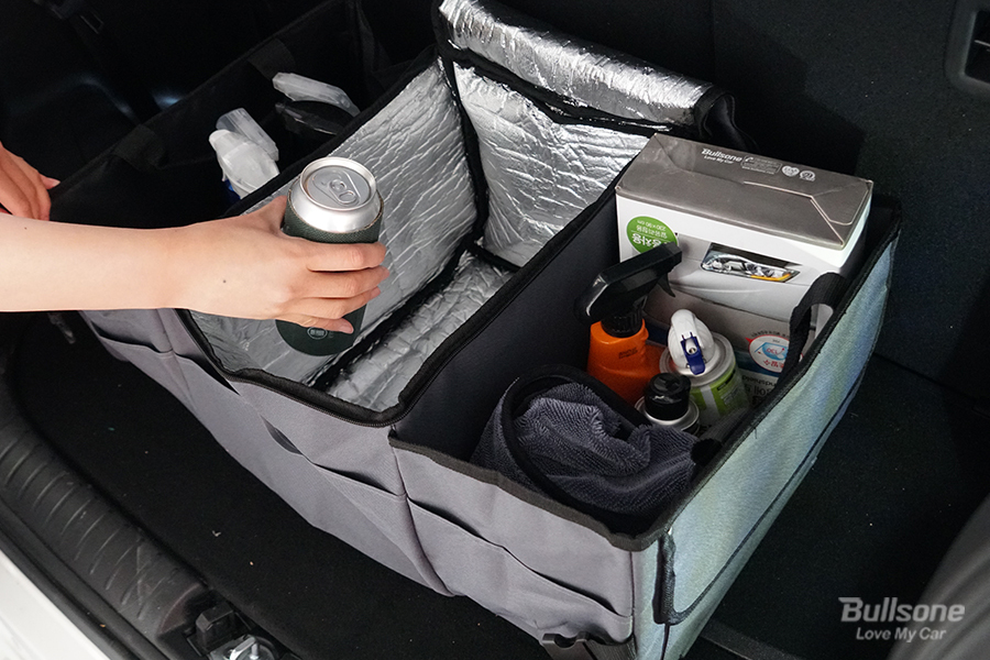 차박 캠핑의 기본 아이템! 바로 자동차 트렁크 정리함이 아닐까 싶은데요. 많은 물건으로 정신없던 자동차 트렁크는 접이식 트렁크 정리함만 있다면 짐을 찾기 쉽고 보기 좋게 수납할 수 있습니다. 접이식 트렁크 정리함은 수납 공간은 물론, 음료 보관용 보냉칸과 수납 포켓이 마련되어 있어 활용성이 높습니다. 바닥면에는 밸크로가 부착되어 있어, 물품을 안정적으로 고정할 수 있습니다. 미사용 시에는 접어서 보관할 수 있으니, 효율적 공간 활용에도 문제없습니다.