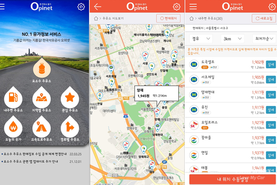 한국석유공사에서는 '오피넷' 사이트와 앱을 운영하는데요. 매일 변화되는 유가를 확인할 수 있어요. 내가 위치한 장소 주변 또는 내가 가야하는 경로를 기반으로 가장 저렴한 금액의 주유소 정보를 보여줍니다. 요즘처럼 주유소마다 가격 편차가 심할 때 사용하면 효과적이에요.