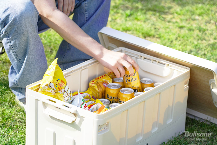 캠핑을 풍부하게 즐기기 위한 필수품인 음식과 음료를 담아가기 위해선 넉넉한 수납 박스가 필요합니다. 캠크루 피크닉 폴딩박스는 넉넉한 수납은 물론, 차에서는 트렁크로 집에서는 정리 수납함으로 다양하게 활용할 수 있는 '핫' 한 아이템입니다. 60L라는 대용량 수납성과 무거운 짐도 편리하게 이동할 수 있는 양사이드 손잡이 홈으로 사용이 편리하고 실용적입니다.