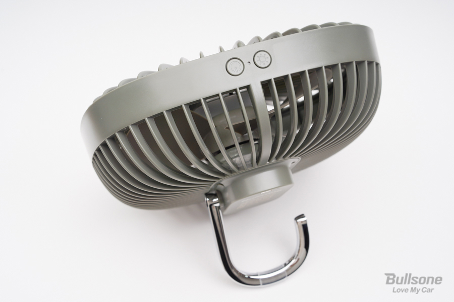 제품의 윗면에는 두 개의 버튼이 있습니다. 왼쪽은 전원 버튼이자 풍속 조절 버튼이고, 오른쪽은 LED 라이트 버튼입니다. 전원 버튼을 누르면 바로 바람이 작동되는데, 이때 버튼을 더 누르는 것을 통해 약풍/중풍/강풍/자연풍으로 풍속을 4단계로 조절할 수 있어요. LED 라이트 역시 버튼을 눌러 총 3단계 밝기로 조절이 가능합니다.