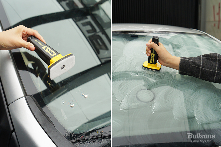 먼저 유막은 건조할 때는 잘 보이지 않고, 물기가 있는 상태에서 쉽게 확인하실 수 있는데요. 왼쪽과 오른쪽을 비교해보면 유막 제거를 통해 시야 확보가 달라진 모습을 볼 수 있습니다.