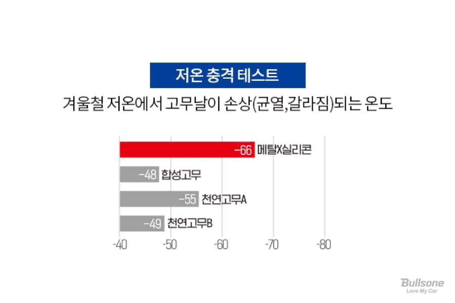 일반적으로 와이퍼에 많이 사용되는 소재인 ①합성고무 ②천연고무 A ③천연고무 B ④메탈 실리콘 와이퍼 총 4가지를 테스트해 보았는데요. 고온 압력 변형 테스트와 저온 충격 테스트, 오존 노화 테스트 3가지를 진행한 결과, 메탈 실리콘 와이퍼가 우수한 성능을 가졌다는 것을 확인할 수 있었습니다.
