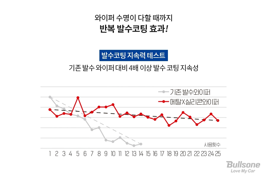 메탈 실리콘 와이퍼는 발수코팅 지속력 테스트 시 기존 발수 와이퍼 대비 4배 이상 발수코팅 지속성을 보이는데요. 와이퍼를 사용하면 발수코팅이 지속되기 때문에 장마철에도 안전하게 운행할 수 있습니다.