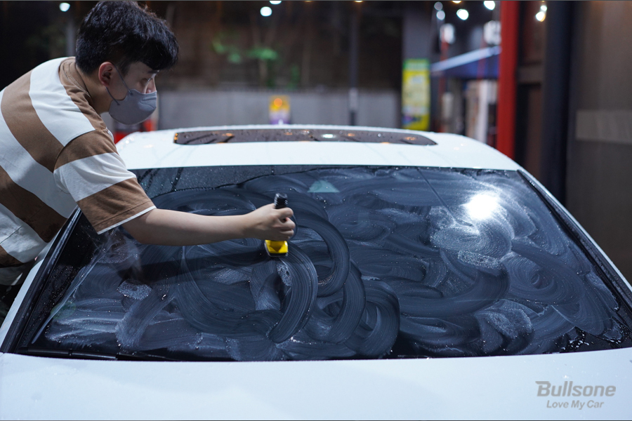 * 유막제거를 하기 전 유리면을 물로 씻어내고 남은 물기를 남겨둔 채 작업하시는 것이 좋습니다.