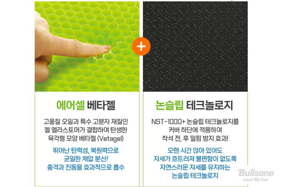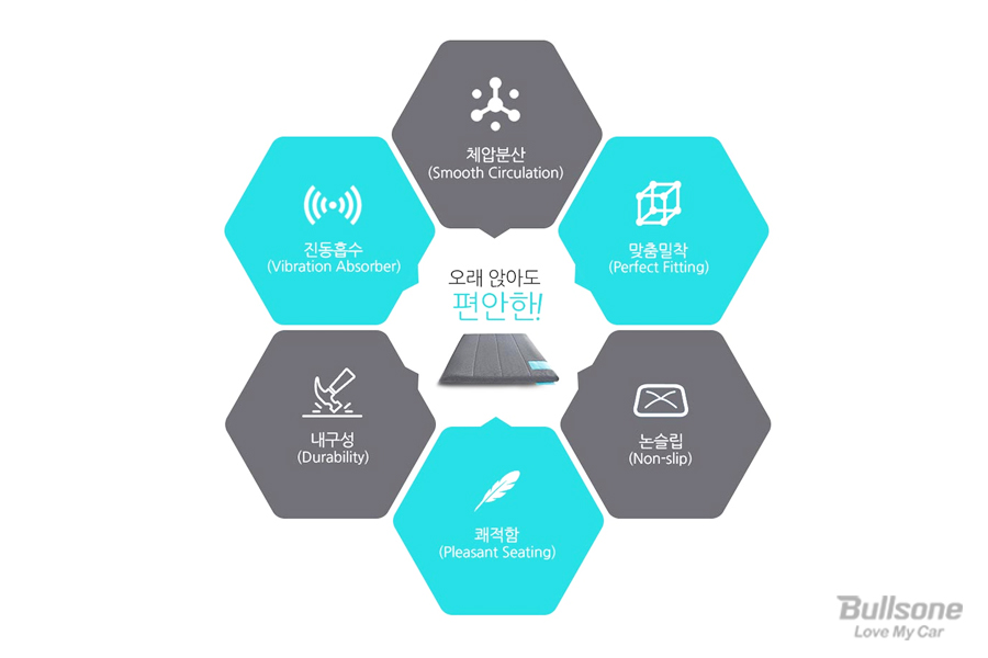 장시간 앉아 있는 현대인들을 위해 출시된 불스원 밸런스온 시트는 세계 특허 출원 중인 2중 허니콤 구조 베타젤 소재를 채택하였습니다. 베타젤은 위에서 가해지는 압력 분산은 물론 뛰어난 통기성으로 최적의 편안함을 제공합니다. 자동차 방석을 사용하다 보면 세척이 쉽지 않고 내구성이 약하기 마련인데요. 밸런스온 시트는 간편 세척이 가능하고 내구성이 좋아 깨끗하고 오랜 기간 실용적으로 사용할 수 있습니다.