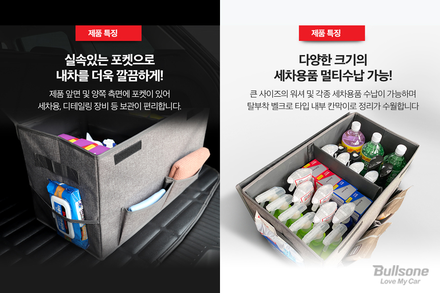 차량을 깔끔하게 만들기 위해서는 정리 정돈이 필요합니다. 트렁크 공간 자체가 넓으므로 물건을 방치해 둔다면, 운전할 때도 소음이 발생하고 트렁크가 금세 지저분해지곤 합니다. 트렁크 정리함 하나만 있어도 차량 내부가 굉장히 깔끔해지는데요. 세련된 디자인과 튼튼한 캔버스 소재가 매력적인 불스원 트렁크 정리함은 넉넉한 수납공간 및 세차 용품 멀티 수납이 가능해 실용성과 편의성을 모두 잡았습니다. 특히 제품 앞면·측면 포켓이 작고 디테일한 제품을 수납하기에 굉장히 편리하답니다.