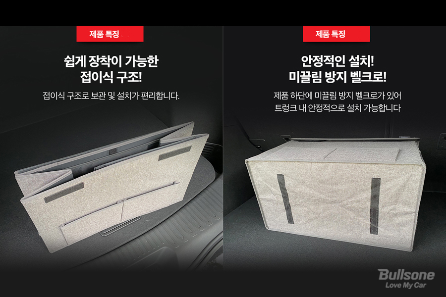 캔버스 트렁크 정리함은 접이식 구조로 사용하지 않을 때는 공간을 적게 차지하여 보관하기 좋습니다. 또한, 미끄러짐 방지 벨크로가 부착되어 있어 트렁크에 안정적인 설치가 가능해요! 트렁크가 기존에 작게 느껴졌다면 꼭 사용해 보셔야 할 아이템 중 하나입니다. 여름철 트렁크에 가지고 다녀야 할 차량용품을 한곳에 모아 편리하고 깔끔하게 보관해보세요.