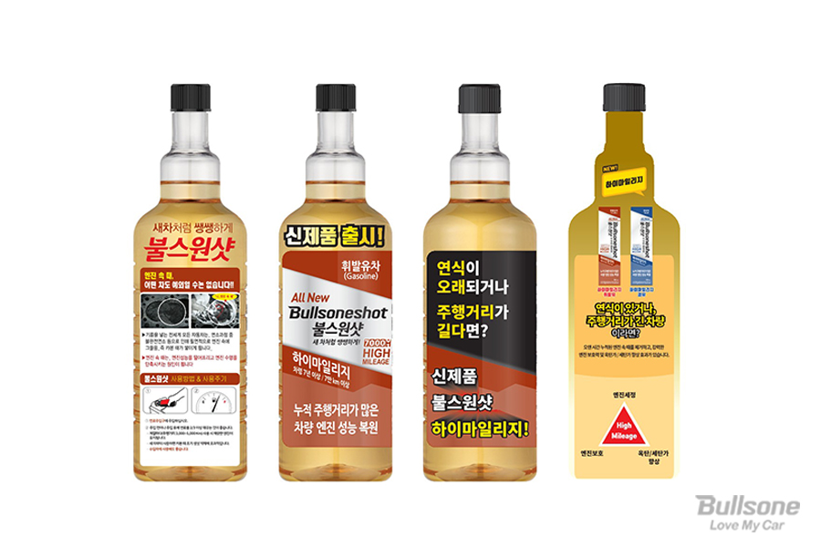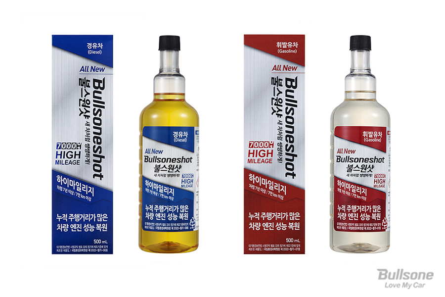 불스원샷 하이 마일리지 경유용에는 세탄 부스터가 첨가되어 시동 성능과 출력을 높여주고, 휘발유용에는 옥탄 부스터를 첨가하여 연소 효율을 향상해 노킹을 방지하는 데 도움을 줍니다.