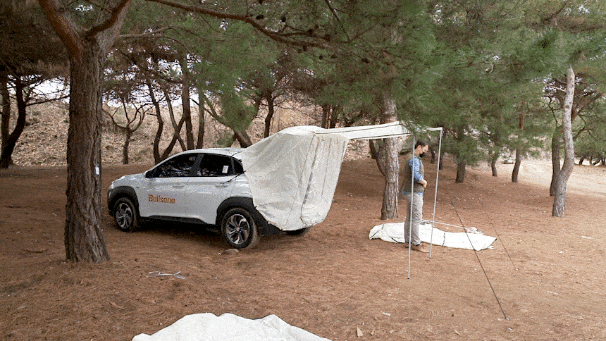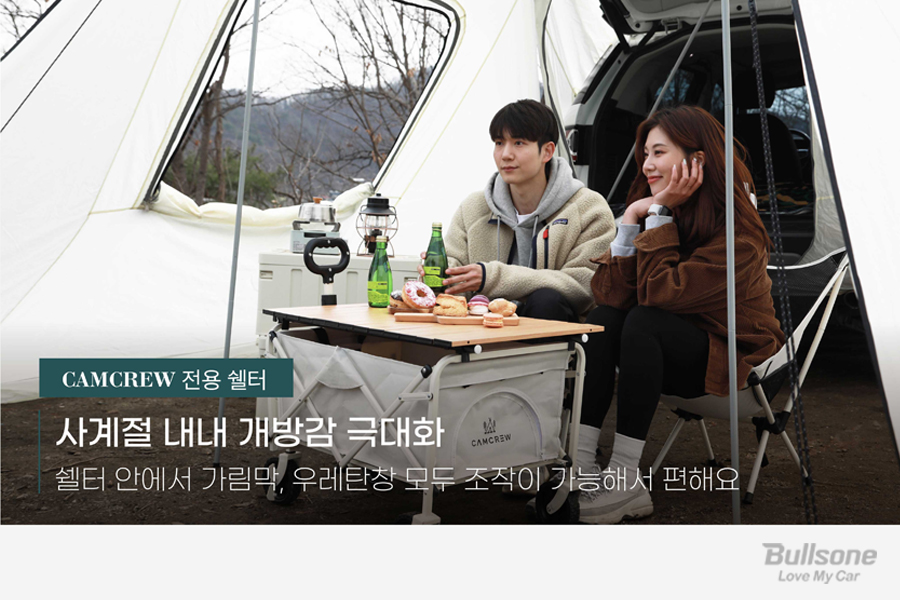 불스원 캠크루 차박 텐트는 가볍게 떠나고 싶은 캠린이들의 니즈에 맞추어 단 3분이면 나만의 휴식처를 만들 수 있게 출시되었습니다. 트렁크를 열고 간편하게 결합할 수 있으며, 전용 쉘터 결합 시 아늑하고 넓은 쉘터를 만들 수 있습니다. 소형 SUV부터 대형 SUV까지 여러 차종 호환이 가능해 선택의 폭도 매우 넓은 게 포인트!