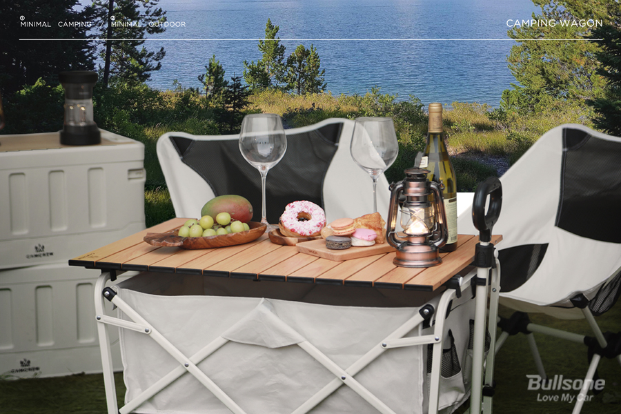불스원 캠크루 캠핑웨건은 무거운 짐들을 한곳에 모아 싣고 다닐 수 있어 편리하며, 상황에 따라 피크닉 테이블로도 변형해 사용할 수 있습니다. 테이블로 사용할 때 아래는 수납함으로도 사용할 수 있어 활용성이 좋아요. 100kg까지 견딜 수 있기 때문에 무거운 맥주와 간식을 가득 올릴 수 있는 근사한 캠핑 테이블이 됩니다.