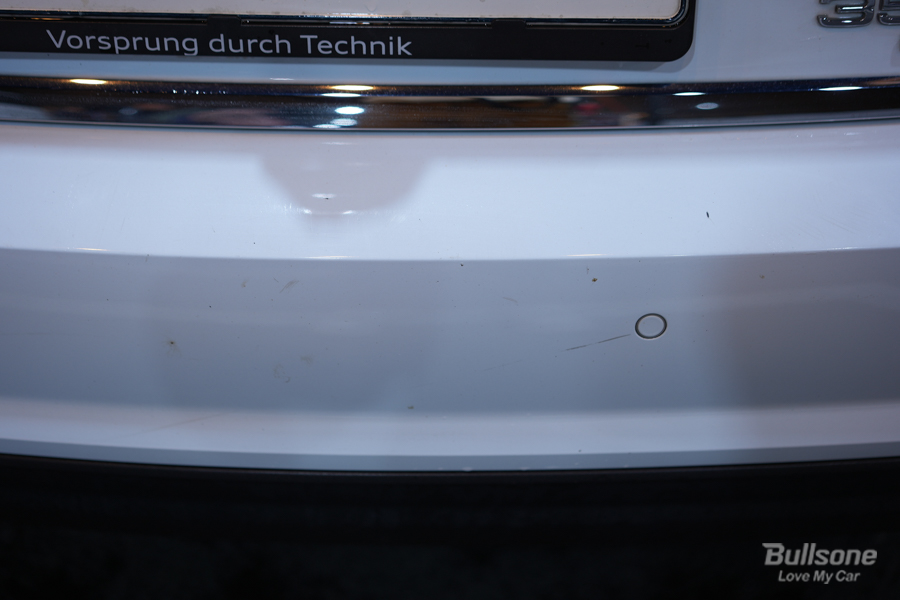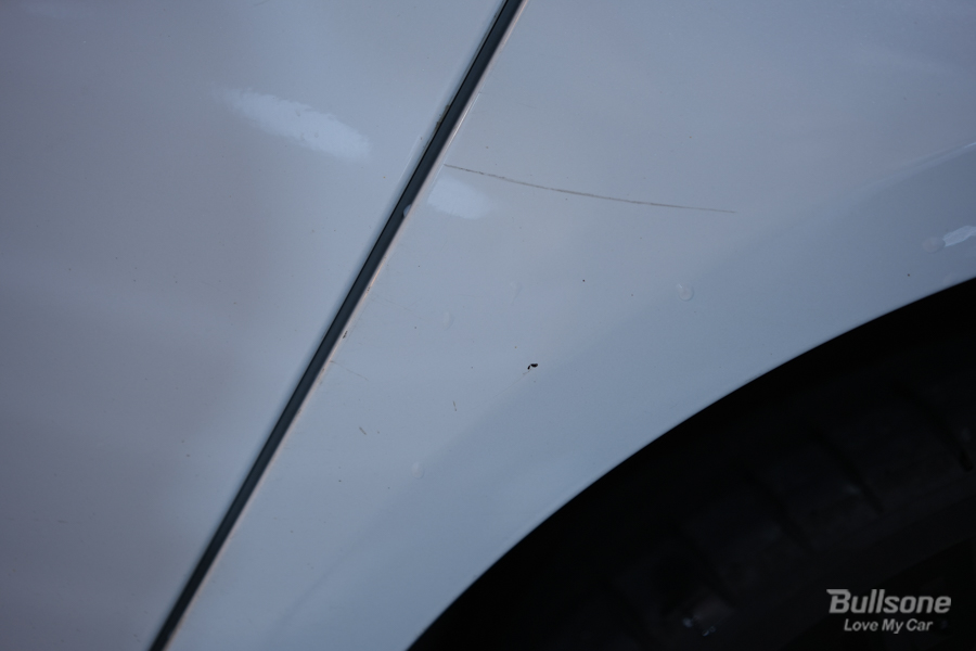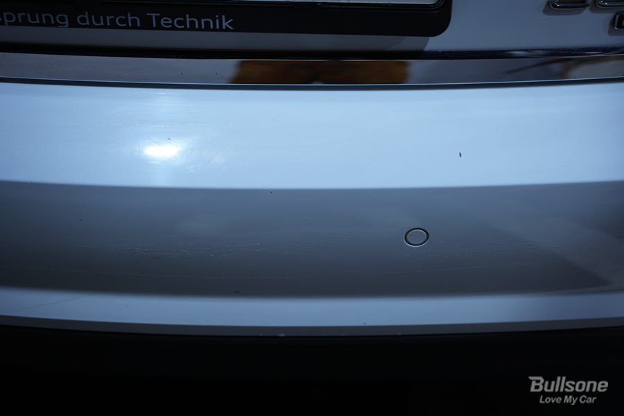 세차하다 발견한 스크래치가 있는 제 차의 뒤 범퍼 부분입니다. 평소 많은 짐을 싣고 내리다보니 미세한 흠집과 도장 면이 까진 부분이 많은 것을 확인했습니다. 세차하면 지워지리라 생각했는데, 이미 도장 부분이 손상되어 기본적인 세차로는 사라지지 않았어요.