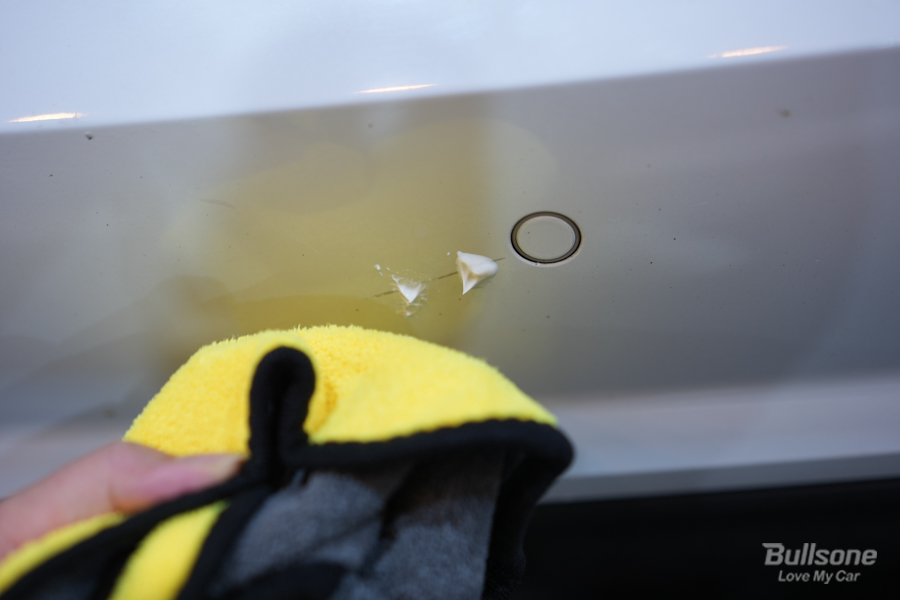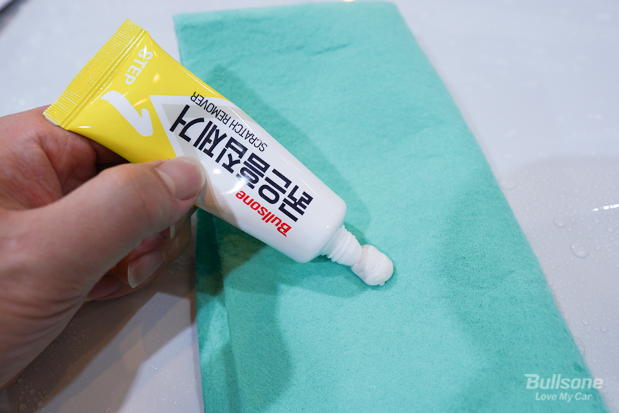 STEP 1! 굵은 흠집 제거용 제품을 천에 소량 묻혀 도장 부위에 문질러 줍니다. 살짝 힘을 주어 시공하면 쉽게 사라져요.