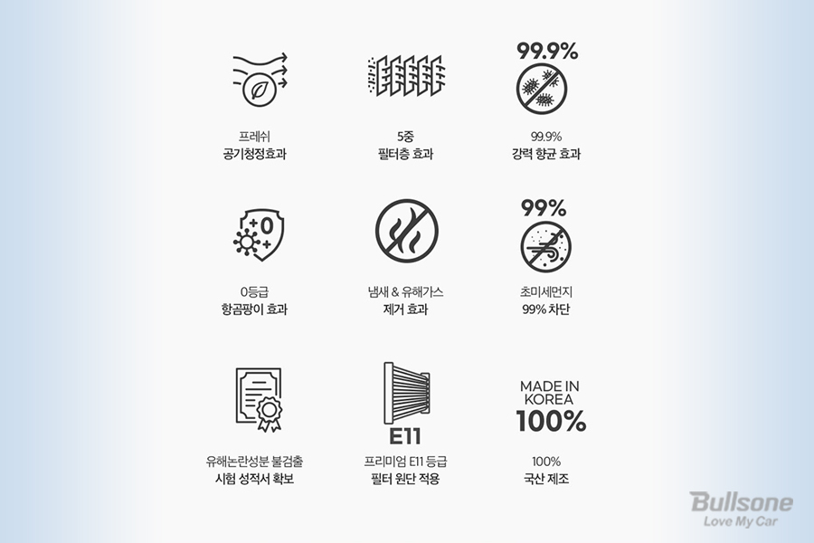 공기 청정 5중 필터층은 실내 유해가스 제거 층, 고분자 항균 층, 1차 활성탄 층, 2차 첨착활성탄 층, 초미세먼지 제거 층으로 구성되어 있습니다. 5단계의 필터층은 공기 청정과 항균 기능뿐만 아니라, 냄새/배기가스/초미세먼지를 걸러주는 중요한 역할을 해요. 여러 단계로 구성된 필터층으로 인해 99% 강력한 항균 효과를 보여줄 뿐만 아니라 100% 국산 제조로 냄새와 유해가스 제거 효과, 0.3 마이크로 이하의 초미세먼지까지 모두 잡아주어 쾌적한 차량 내부를 만드는 데 도움을 줍니다.