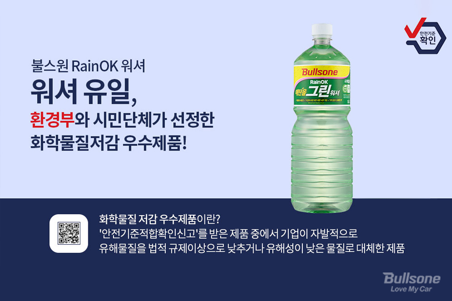 불스원 레인OK 에탄올 그린 워셔는 식물 발효 에탄올과 생분해도가 높은 원료가 사용되어 세정력과 안전성을 모두 갖춘 제품입니다. 앞 유리를 잘 닦아줄 뿐만 아니라 유해성이 낮은 편이에요. 불스원 레인OK 에탄올 그린 워셔는 워셔 중 유일하게 환경부와 시민단체가 선정한 화학 물질 저감 우수 제품이랍니다.