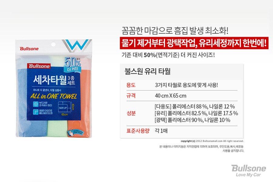 세척 후 제대로 닦지 못하면 얼룩이 그대로 남기도 하고 흠집이 생길 수 있어 다용도용과 유리, 광택용을 따로따로 구분하여 관리해주시는 게 필요합니다. 불스원 세차 타월 3종 세트는 물기 제거부터 광택 작업, 유리 세정까지 한 번에 할 수 있도록 3가지 타월을 모두 구성한 제품입니다. 꼼꼼한 마감으로 흠집 발생을 최소화하였으며, 기존 대비 50% 면적이 더 커진 사이즈로 경제적입니다. 깨끗하게 세차를 끝내고 남아 있는 물기 제거는 세차 타월 3종 세트로 마무리해보시는 건 어떨까요?