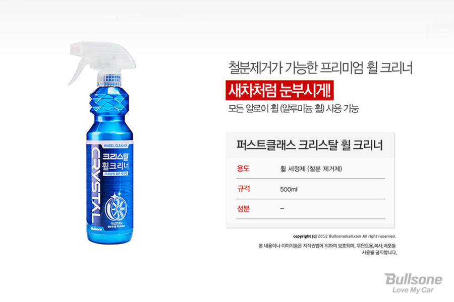 불스원 크리스탈 휠클리너는 지저분한 휠 주변 철분을 제거해 깨끗하게 만들어주는 전용 제품입니다. 증점 타입 세정제로 흐르지 않고 오염물을 제거하며, pH 중성으로 모든 종류의 알로이 휠에 사용할 수 있습니다. 사용법도 간단해 뿌리고 보랏빛으로 변화하는 세정 효과를 확인하실 수 있습니다. 그동안 어렵다는 이유로 방치했던 바퀴 휠! 비 오는 날에도 불스원 크리스탈 휠크리너를 사용하여 깔끔하게 관리해보시길 바랍니다.