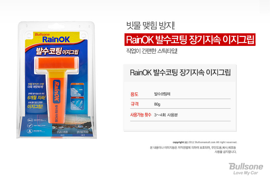 불스원 레인OK 발수코팅 이지그립은 작업이 간편한 스틱 타입으로 누구나 손쉽게 발수코팅을 할 수 있는 제품입니다. 휴대성이 좋아 시공에 어려움이 없으며, 용액이 손에 묻지 않아 위생적으로 사용할 수 있습니다. 유리 전면 어디든 필요한 부위에 바르고 닦는 것만으로 맑은 시야를 만나실 수 있습니다. 비 오는 날에도 쉽게 사용이 가능하며 1회 사용으로 최대 6개월까지 발수 효과가 지속되는 만큼, 발수코팅은 이지그립으로 해결해보시길 바랍니다.
