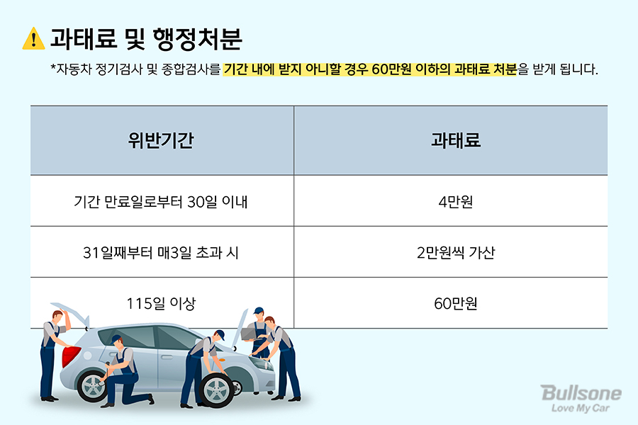 지속해서 자동차 검사를 받는 것은 운전자의 의무입니다. 만약 해당 날짜 내 검사를 받지 못한다면 4만 원의 과태료가 발생하며 이후 31일이 초과 시 매 3일 추가 과태료가 부과되는데, 최대 60만 원 이하의 과태료 처분을 받게 됩니다.