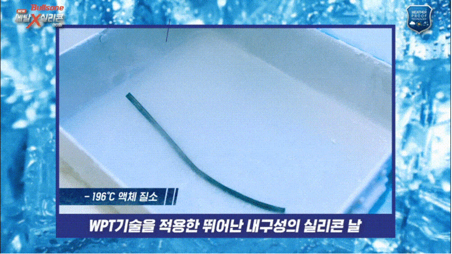 불스원에서 저온 충격 테스트도 완료하였는데요, 196도의 액체 질소에서 WPT 기술이 적용된 실리콘 날의 내구성을 확인할 수 있습니다.
