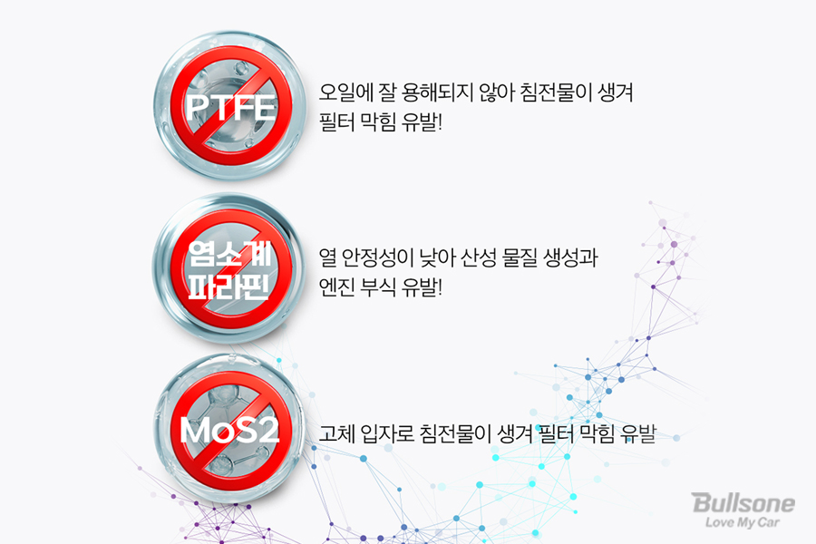 엔진코팅제도 저렴하다고 아무거나 사용하면 위험합니다. 코팅제에 나쁜 물질이 들어가는 경우도 있거든요. 불스원 엔진코팅제 골드는 3대 엔진 유해 물질 무첨가를 통해 엔진에 안전한 물질로만 구성되어 있습니다. 따라서 신뢰성이 높고, 기능이 탁월합니다.